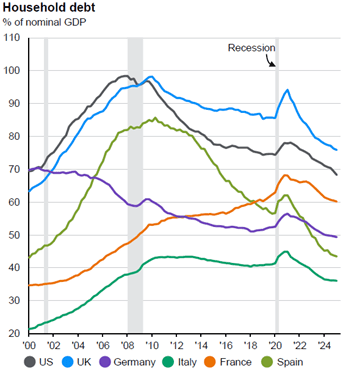 There are a couple of offsets for the household sector – overall household wealth recovered following the market disruption in April, creating a positive wealth effect, and upcoming Q1 2026 US tax refunds will provide a cash injection to households to help short term offset to this negative trend. Even in the UK and Europe, in aggregate, the consumer looks in relatively good health and strong enough to weather this cooling backdrop. With a longer-term view, consumers have, at varying levels, spent the years paying down debt since the financial crisis, impressively so for some of our southern European cousins.
